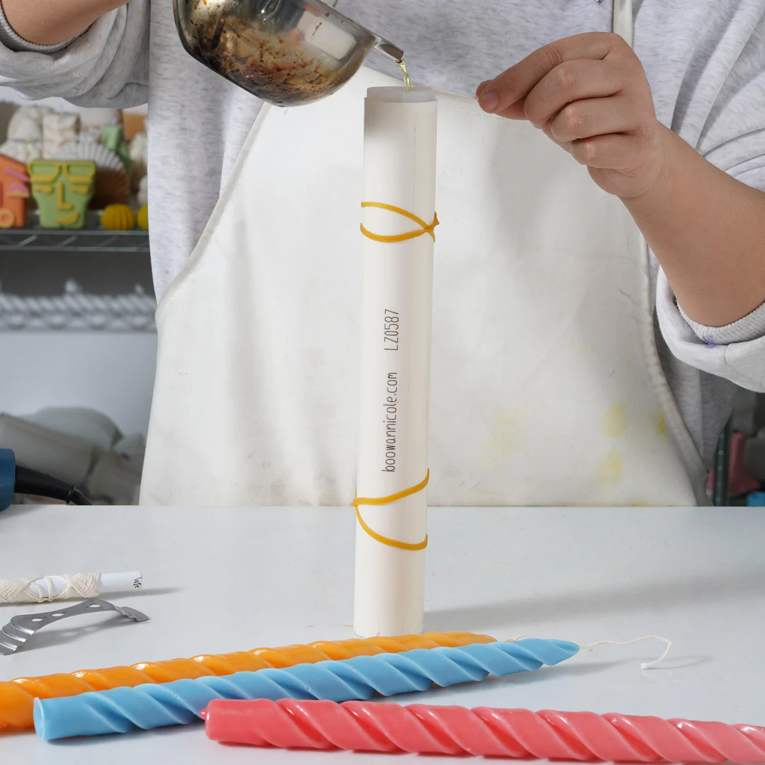 Praktische Silikonform für Kerzen mit seitlichem Einschnitt, Kunststoffhülle und Gummibändern zum festen Zusammenziehen – für stabiles Gießen und leichtes Entformen ohne Detailverlust. Aus Platinum-Food-Grade-Silikon, geeignet für Bienenwachs, Sojawachs und Paraffin.