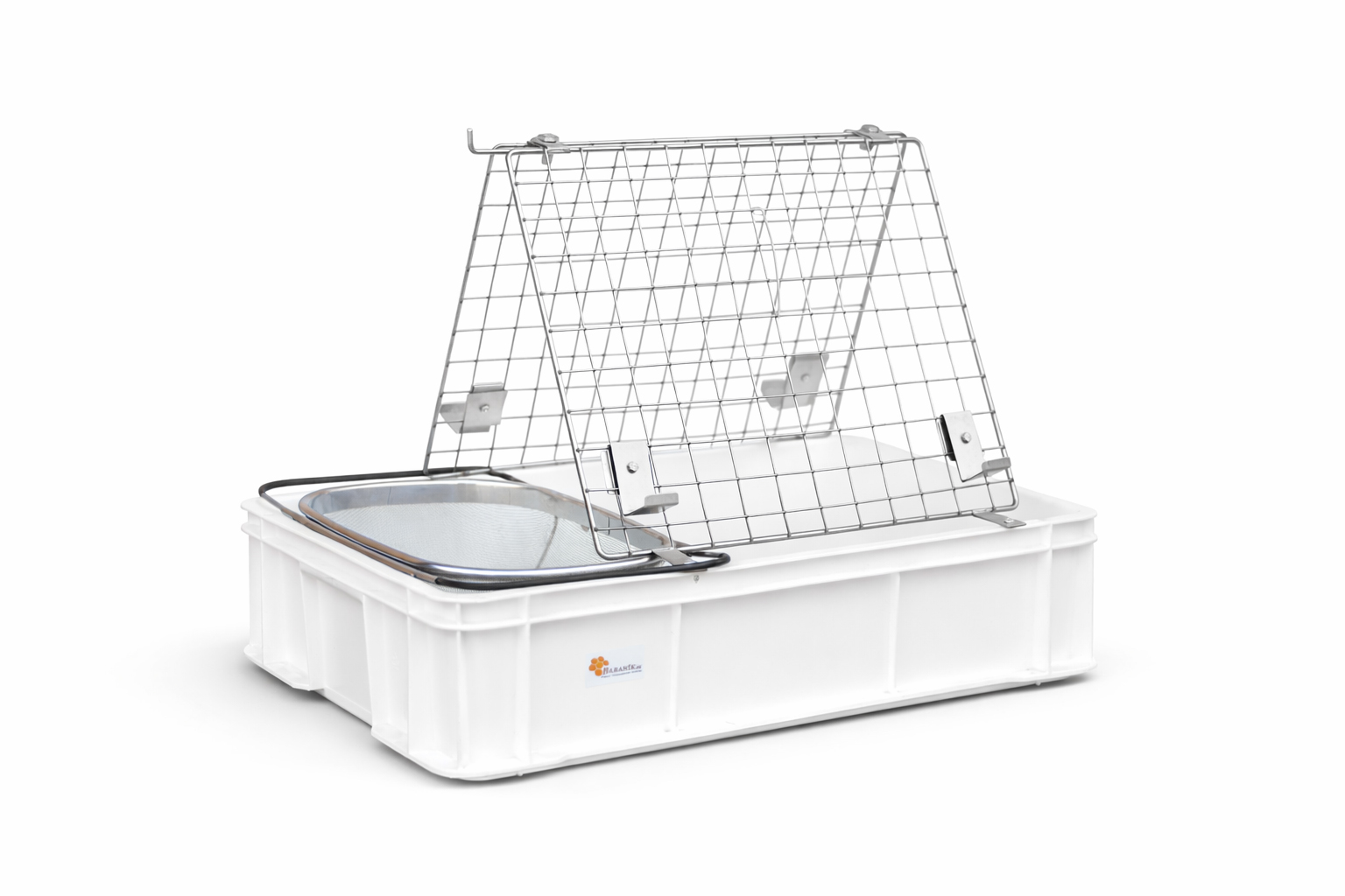 Das Gerät besteht aus einem Gitter mit Halter, einer Kunststoffkiste und einem Sieb.
